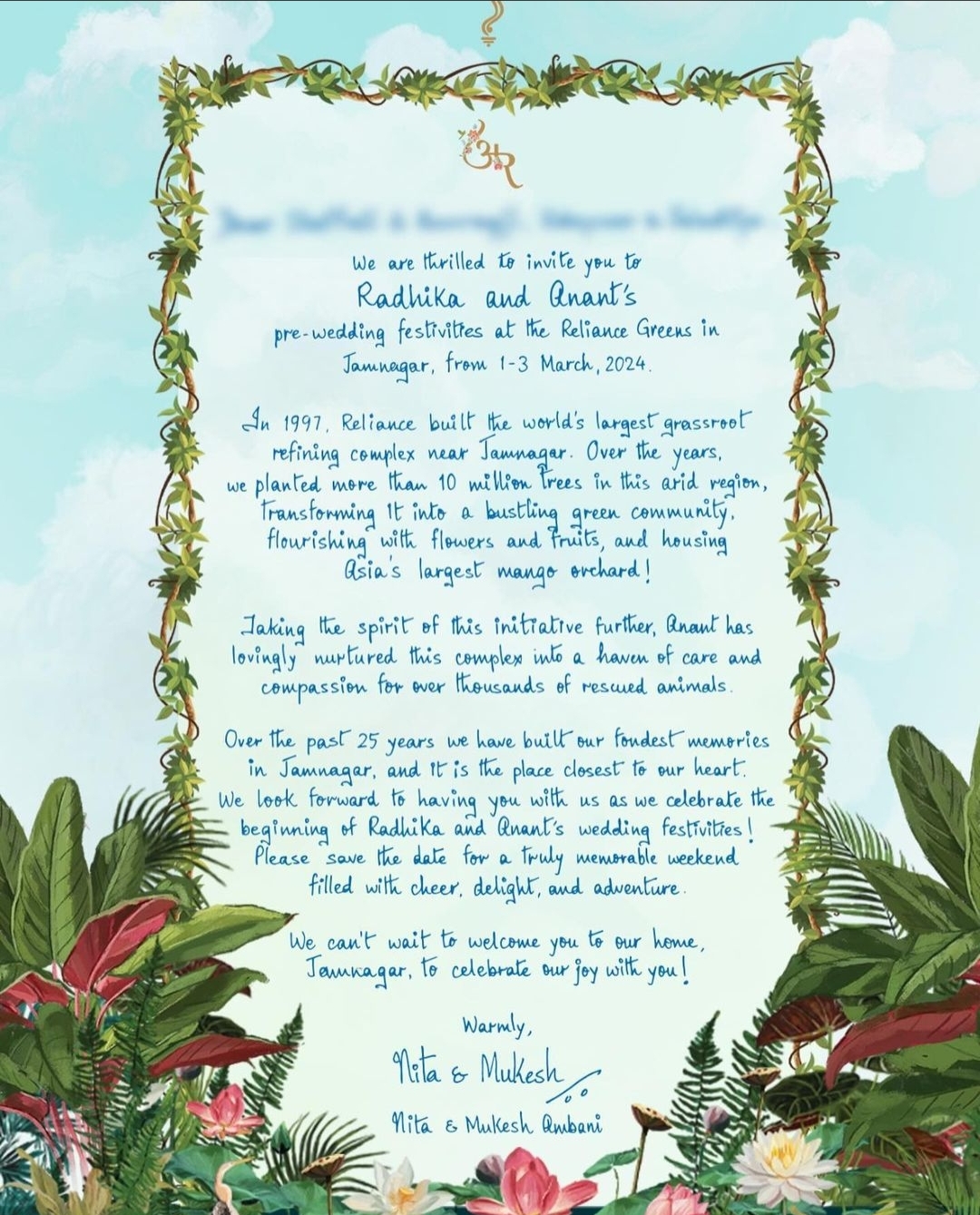 કાર્ડ અનુસાર જોઈ શકાય છે કે 1 માર્ચ 2024 થી બંનેના લગ્નની રસમો શરૂ થઇ જશે અને આ રસમ આપણા ગુજરાતના જામનગરની અંદર કરવામાં આવશે, હાલ પૂરતી તો લગ્નની પાક્કી તારીખ તો આ કાર્ડમાં લખવામાં આવી નથી પરંતુ ત્રણ દિવસ અનંત અંબાણી તથા રાધિકા મર્ચન્ટનું પ્રિ વેડિંગ ફંક્શન યોજાશે.